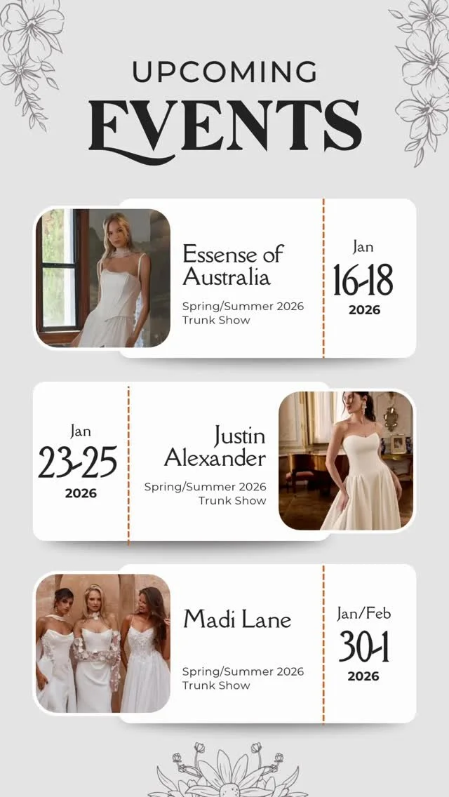 A: There are several ways to get great deals on an Ellie's Bridal gown. The first is by attending a trunk show where we feature a particular designer that we carry and get permission from that designer to offer you a great discount on any of their gowns. Trunk Show discounts are only available during the Trunk Show event, and appointments must be made to attend the event.