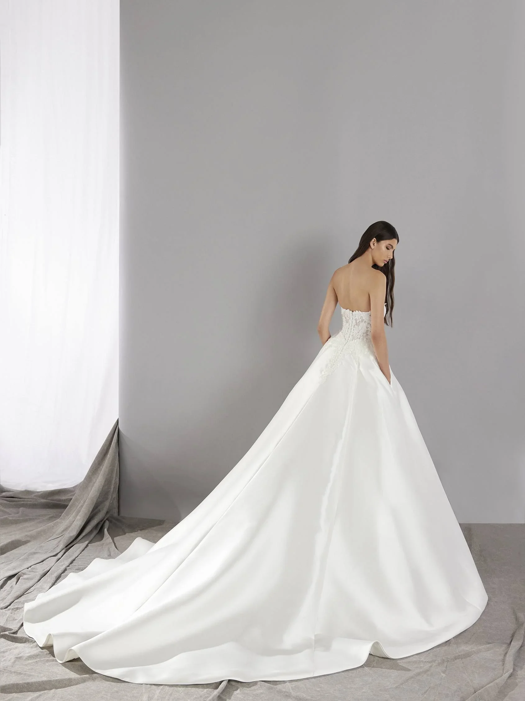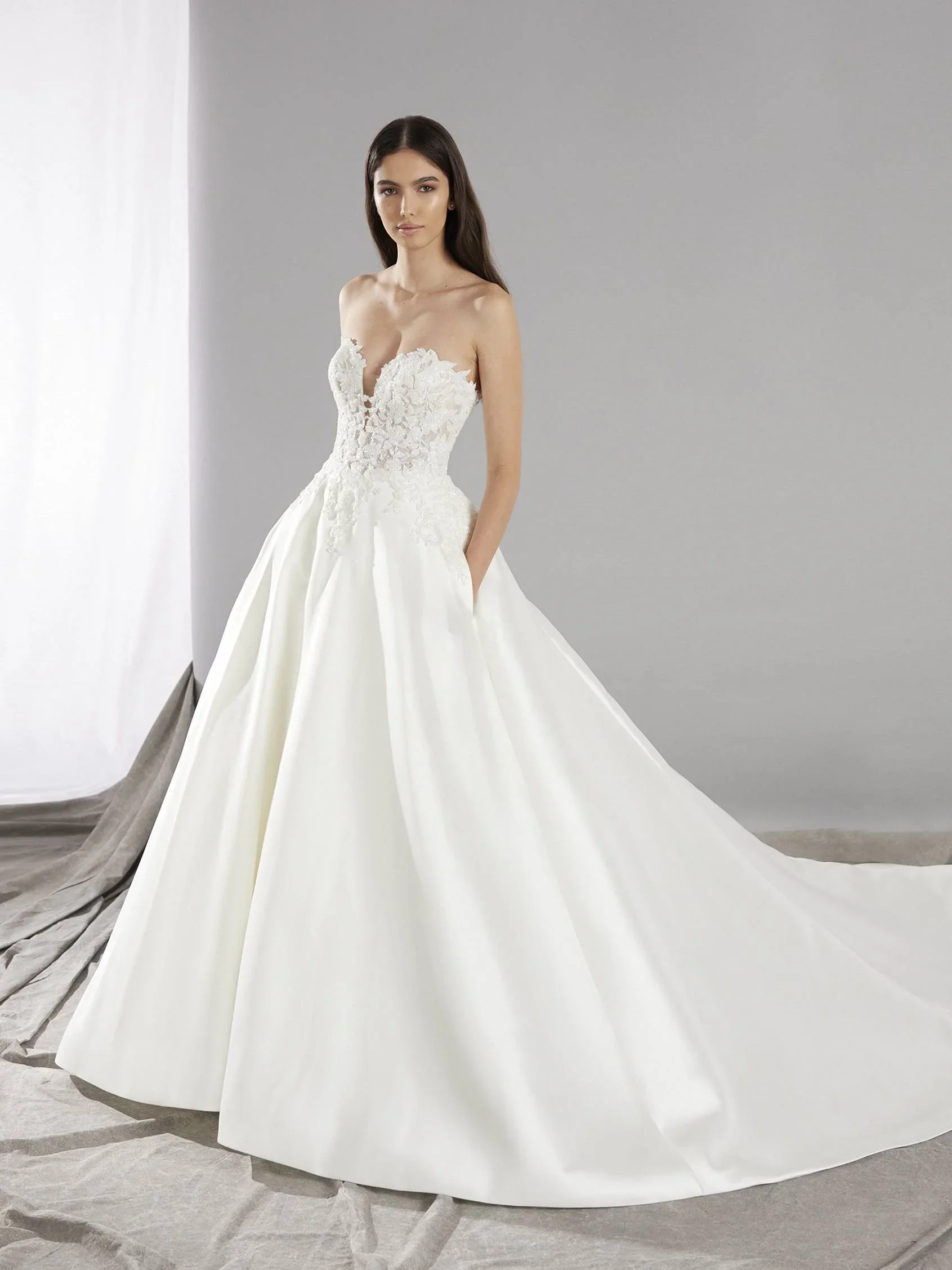 Pronovias is a family firm that began life in El Suizo, a prestigious Barcelona store founded in 1922 that specialised in the lace, embroidery and high-quality silk fabrics demanded by the brides of Catalonia’s high society. Now, the Pronovias Group is the leading international design house, dressing brides in more than 72 countries. The name Pronovias is synonymous with fashion and glamour for brides. The family that founded the company still manages its operations and expansion process, transmitting the quality and design philosophy that characterises its work. This is the core collection with a wide variety of bridal gowns for stylish brides. These include signature styles such as breathtaking minimalist, glamorous laces, dramatic ball gowns, ethereal romance, stylish classics and beyond. Ellie's Bridal Boutique is proud to be a long-standing partner of Pronovias Barcelona for nearly 20 years.